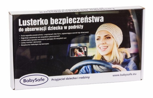 Duże lustro marki BabySafe. Niezwykle przydatne w sytuacji, gdy dziecko podróżuje na tylnej kanapie. Lusterko montowane jest na tylnym siedzeniu na zagłówku oparcia fotela. Lusterko pozwala utrzymać kontakt wzrokowy z dzieckiem, które podróżuje na tylnej kanapie w foteliku zamontowanym tyłem do kierunku jazdy oraz stale kontrolować jego samopoczucie i stan w podróży. Lusterko w prosty sposób montuje się na zagłówku oparcia fotela.