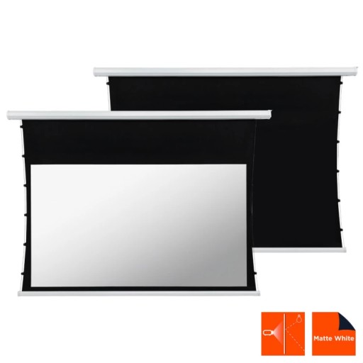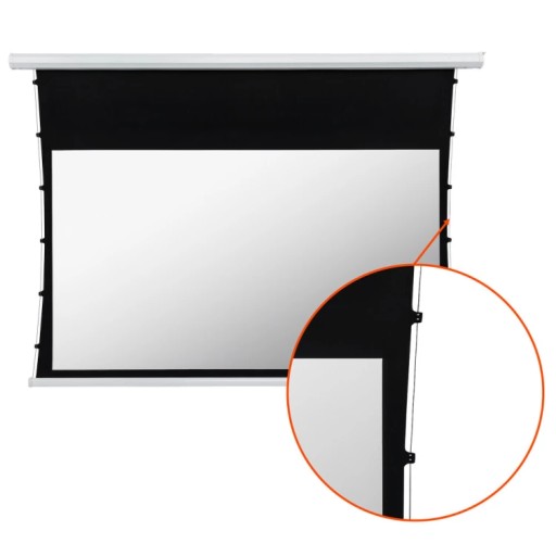 System napinania zapewnia zawsze optymalną płaskość w obszarze krawędzi. Czarne maskowanie zapewnia optymalne rozgraniczenie projekcji i jednocześnie zwiększa kontrast, a czarna nieprzezroczysta powłoka z tyłu tkaniny projekcyjnej zapobiega przenikaniu światła.