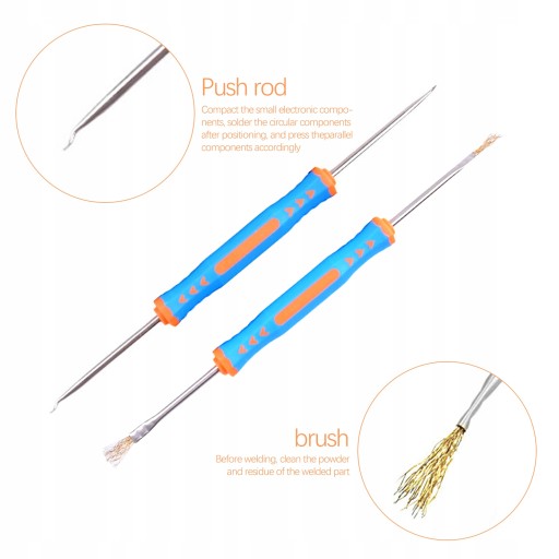 Ten produkt jest połączeniem pomocniczych narzędzi spawalniczych. Narzędzie służy do naprawy, ustawiania, demontażu elementów, szlifowania, czyszczenia i usuwania cyny z płyty maszyny. Dzięki kombinacji narzędzi można delikatniej przeprowadzić naprawę elementów elektronicznych.