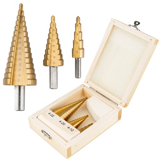 ZESTAW WIERTEŁ STOŻKOWYCH - 3 wiertła w rozmiarze 4-32mm wykonane z szybkotnącej stali HSS!