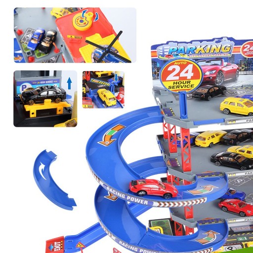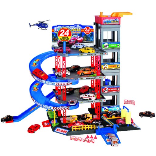 Rewelacyjny wielopoziomowy parking marki WOOPIE ze stacją benzynową, podnośnikiem, windą, myjnią, warsztatem samochodowym oraz lądowiskiem dla helikoptera rozbudzi wyobraźnię każdego fana szybkich samochodów oraz motoryzacji. Aby pojazd mógł dostać się na parking należy podnieść rampę. Dzięki windzie (która porusza się ręcznie) pojazdy mogą przemieszczać się pomiędzy piętrami. Szybki zjazd samochodów z poszczególnych poziomów umożliwia specjalny, kręty zjazd. Garaż wyposażony jest także w myjnię samochodową oraz stację benzynową. Ponadto w zestawie znajdują się 4 metalowe samochody oraz helikopter.