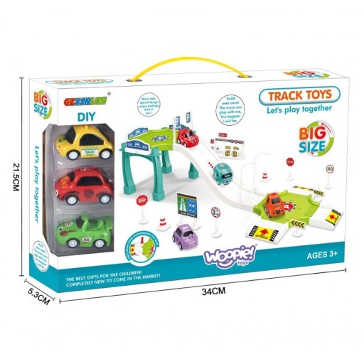 WOOPIE Tor Parking Garaż Samochodowy Zestaw Stacja Paliw Znaki Drogowe + 3 Auta