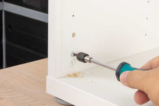 Za pomocą dołączonego wiertła i pasującego ogranicznika głębokości rozwiercamy wyrwane otwory pod wkręty na określoną głębokość. Zapobiega to przewierceniu korpusu mebla na wylot.