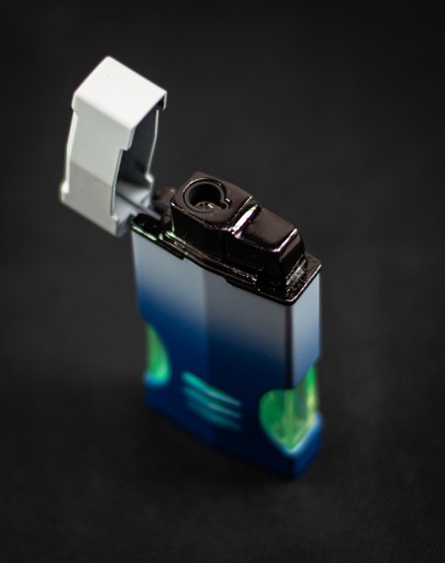 - W momencie otwarcia wieczka zapalniczki zbiornik na gaz podświetlna się na zielono