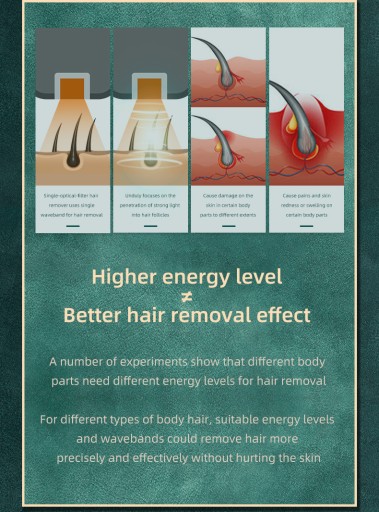 Nie ma skutków ubocznych. Przyjmując amerykańską technologię impulsowego światła o dużej intensywności (HIPL), ten środek do usuwania włosów jest używany z filtrami optycznymi JOVS, które mogą odfiltrować wszelkie bezużyteczne światło, takie jak promienie ultrafioletowe, umożliwiając dotarcie użytecznego światła do mieszków włosowych i eliminując wszelkie skutki uboczne wywołane przez światło które mogą uszkodzić skórę.