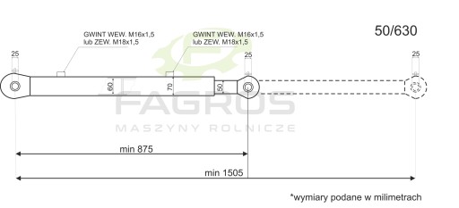 - Długość siłownika złożony 875 mm (mierzone w osiach łożysk)