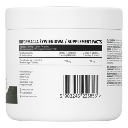 OstroVit Chlorella to suplement diety, który został opracowany na bazie glonów należących do jednokomórkowych mikroalg z gromady zielenic. Produkt ostatnimi czasy zaliczany jest jako superfoods dzięki swemu plejotropowemu działaniu na organizm ludzki. Chlorella to bogactwo witamin, minerałów oraz fitozwiązków, które działają prozdrowotnie na organizm człowieka. Produkowane metodą Broken Cell Walls (pęknięte ściany komórkowe) co znacznie zwiększa wchłanialność suplementu.