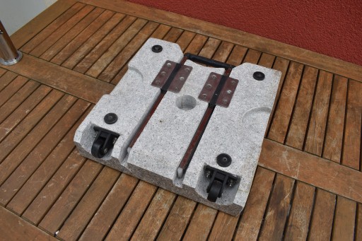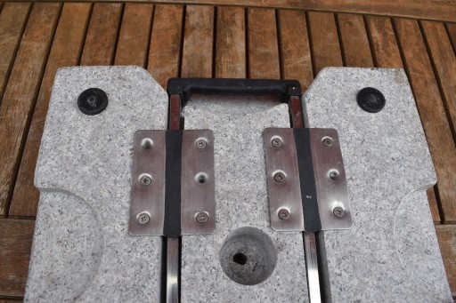 Solidna granitowa podstawa o masie 28 kg, nadaje się do parasoli o średnicy do 1,8 metra. Rurka nośna ze stali nierdzewnej nadaje się do drążków parasolowych o średnicy Ø 4,8 cm. Z poręcznymi wgłębieniami na uchwyt, stopami przyjaznymi dla podłogi przed ocieraniem i śrubami montażowymi. Stojak jest łatwy do przenoszenia dzięki wysuwanemu uchwytowi i kółkom.