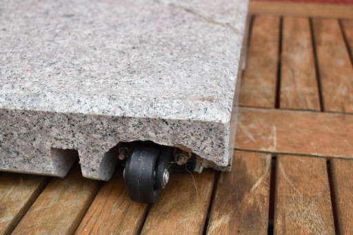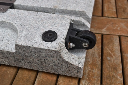Solidna granitowa podstawa o masie 28 kg, nadaje się do parasoli o średnicy do 1,8 metra. Rurka nośna ze stali nierdzewnej nadaje się do drążków parasolowych o średnicy Ø 4,8 cm. Z poręcznymi wgłębieniami na uchwyt, stopami przyjaznymi dla podłogi przed ocieraniem i śrubami montażowymi. Stojak jest łatwy do przenoszenia dzięki wysuwanemu uchwytowi i kółkom.