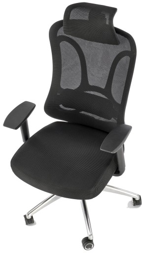 - Regulowany w dwóch płaszczyznach (góra-dół, kąt pochylenia). Pokryty przewiewną siatką w kolorze czarnym. Wykonany z czarnego tworzywa sztucznego.