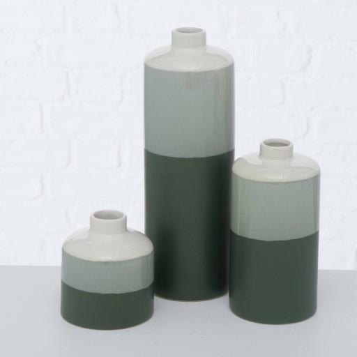 - Różne odcienie stonowanej zieleni: Każdy z wazonów prezentuje paski o dwóch odcieniach zielonego. Całość tworzy harmonijną całość i nadając wnętrzu subtelny urok.