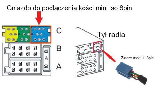 Podłączenie sprowadza się do wpięcia kostki 8pin z tyłu radia.
