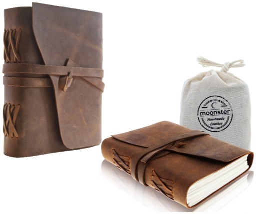 Rustykalny, antyczny, skórzany notatnik firmy Moonster jest idealnym towarzyszem dla wszystkich osób, które lubią pisać i uwielbiają styl vintage.