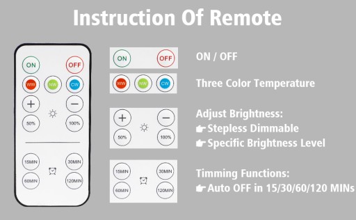 Ściemnialne i czasowe żarówki E26】 Żarówki bateryjne są dostarczane z pilotem: 3 tryby (białe światło, neutralne światło i ciepłe światło) przełączane za pomocą pilota. Użyj domyślnego przycisku ściemniacza, aby ustawić dokładną jasność na 50% lub 100%, lub użyj przycisku - lub +, aby wybrać poziom jasności. Światła można włączać i wyłączać za pomocą pilota lub skorzystać z opcjonalnego timera, który automatycznie wyłączy światła po 15, 30, 60 lub 120 minutach. Światła można łatwo włączać i wyłączać, po prostu dotykając obiektywu.