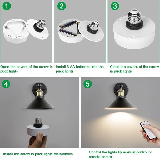 【Bezpieczne w użyciu lampy Puck bez zasilania elektrycznego】 Nie wymaga okablowania, łatwa instalacja, bezpośrednia instalacja bez podłączania przewodów do oprawy oświetleniowej (gniazdo lampy E26/E27, oprawa oświetleniowa nie wchodzi w skład zestawu). Lampę można swobodnie włączać i wyłączać za pomocą sterowania ręcznego lub pilota zdalnego sterowania w odległości do 7 stóp, w zależności od potrzeb, co jest bardzo wygodne. Lampa Led Light jest zasilana bateriami 3 AA, nie obsługuje zasilania sieciowego, aby zapalić żarówkę, należy wymienić akumulator.