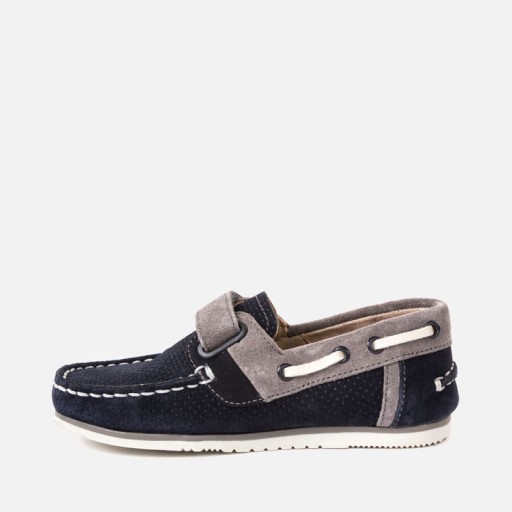 Mokasyny dla chłopca w stylu klasycznym i eleganckim. Buty ponadczasowe, idealne na specjalne okazje. Buciki z wewnętrzną wyściółką ze skóry i wewnętrzną podeszwą z oddychającej bawełny. Zewnętrzna część wykonana z połączenia skóry i kontrastowych materiałów. Gumowa podeszwa antypoślizgowa dla pewniejszych kroków. Zapięcie na regulowany rzep, co gwarantuje doskonałe przyleganie do stopy.