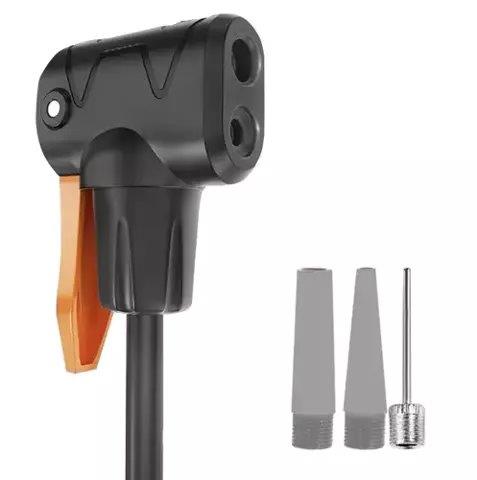 - KOMPATYBILNA + 3 KOŃCÓWKI – pompka jest kompatybilna z różnymi wentylami. Posiada podwójną uniwersalną głowicę do wentyli samochodowych i rowerowych. Dodatkowo jest wyposażona w igłę do piłek oraz końcówkę do pompowania materacy czy kółek do pływania.