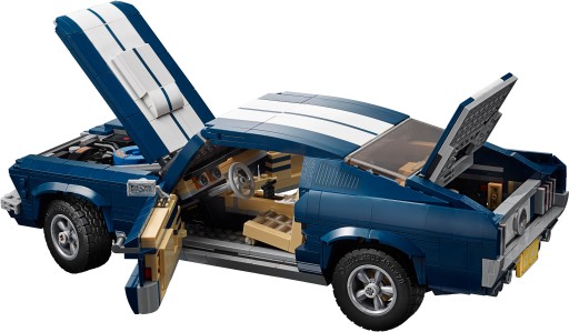 Autentyczna replika Forda Mustanga z lat 60. XX wieku z granatową karoserią, białymi pasami wyścigowymi, wlotem powietrza, przyczepnymi oponami, imponującymi felgami z pięcioma szprychami oraz dodatkowym wyposażeniem opcjonalnym.