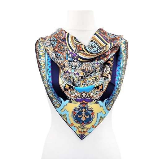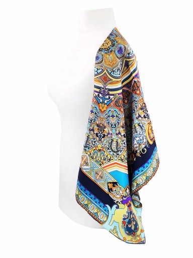 Przepiękna jedwabna chusta, marki LaDorena® wykonana z najwyższej jakości naturalnej ciężkiej satyny jedwabnej o rzadko dostępnej grubości aż 14 M/m, Wymiary 90x90 cm. Chusta zachwyci każdą elegancką kobietę.