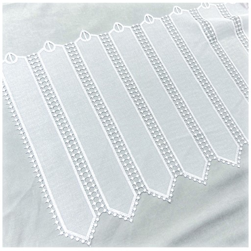 Przedmiotem sprzedaży jest śnieżnobiała firanka typu zazdrostka . Tkanina do złudzenia przypomina batyst , materiał jest cienki, delikatny. Lekka cienka tkanina bardzo przyjemna w dotyku , cechuje się także przewiewnością i zapewnia doskonałą cyrkulację powietrza . Każdy segment został połączony aplikacją gipiurową w formie niewielkich kuleczek gipiurowych tworząc niesamowity efekt . Firaneczka nie wymaga obszywania . Jeden segment ma szerokość około