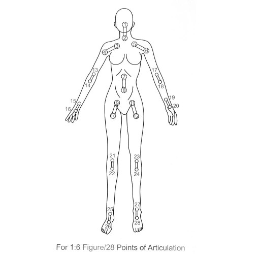 28 punktów artykulacji. STAWY, z których większość to przeguby kulowe, mają dużą elastyczność, a ciało może doskonale wykonywać różne gesty i dopasowywać do siebie różne ubrania.