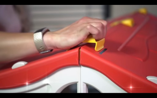 Składany domek z czerwonym dachem przypominającym dachówkę. Posiada niebieskie, otwierane drzwiczki z przodu oraz drugie białe z tyłu.