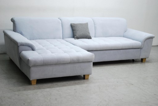 Narożnik jest fabrycznie nowy wykonany z najwyższej jakości z tkaniny strukturalnej o średnim splocie. Wykończenie powłoki materiału jest matowe, materiał miły w dotyku Tkanina ta nie przeciera się, nie pęka, nie gniecie i posiada dużą wytrzymałość. Mebel stoi na chromowanych nóżkach. Narożnik jest z funkcją spania Mebel jest w kolorze jasno niebieskim.