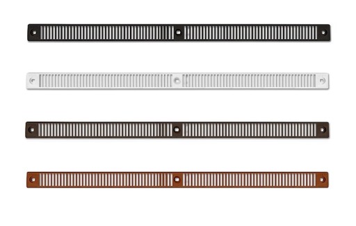 Elementy nawiewnika wykonane są z profili aluminiowych malowanych proszkowo na kolor biały (część wewnętrzna) oraz okap na kolor złotego dębu RAL8003 w którym zakończenia profili wykonane są z czarnego ABS.