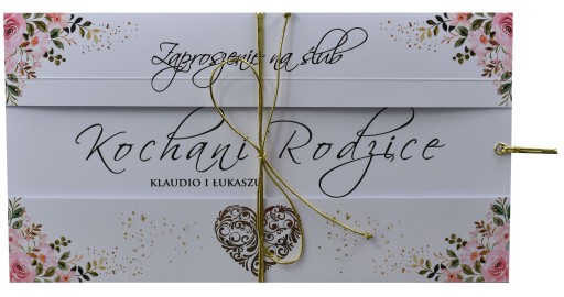 - Karnet wykonany techniką Hot-stampingu druku i tłoczenia z użyciem folii złotych i matryc wypukłych ze ZŁOCONYM SERCEM KORONKOWYM