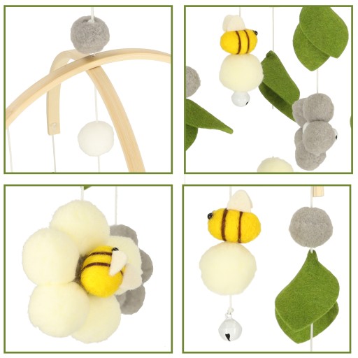 ✔️ Zawieszki są wykonane z miękkiej bawełny, a konstrukcja karuzeli jest zrobiona z gładko oszlifowanego drewna. Dodatkowo pomiędzy kwiatkami znajdują się małe dzwoneczki.