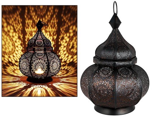 - Marokańska ogrodowa lampa wisząca/stojąca, czarna na zewnątrz i miedziana od wewnątrz, opalizująca konstrukcja chwyta światło świecy i odbija je, tworząc piękny efekt. Perforacje wyczarowują orientalną grę cieni w pomieszczeniu.