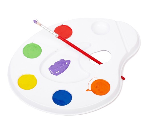 Paletka malarska do mieszania farb wykonana z tworzywa sztucznego. Posiada 6 wgłębień na farby, wygodny uchwyt oraz miejsce do odłożenia pędzelka.