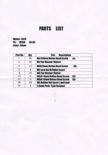 КОМПЛЕКТ ВИНТОВ ДЛЯ ОБТЕКТЕРОВ KAWASAKI ZX-10R 2004-2005 гг.