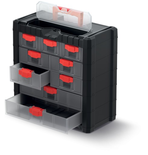 Organizer (szafka na narzędzia) Multicase Cargo KMC501 marki Kistenberg posiada transparentne 3 małe szuflady, 4 średnie i 2 duże oraz 1 organizer w pokrywie.
