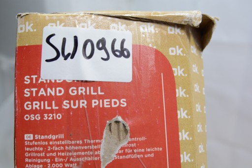 Grill elektryczny o mocy 2000 W, bezstopniowa tegulacja temperatury, zdejmowany termostat z elementem grzejnym, wyjmowana kratka grillowa z regulacją wysokości, nóżki o wysokości 71 cm.