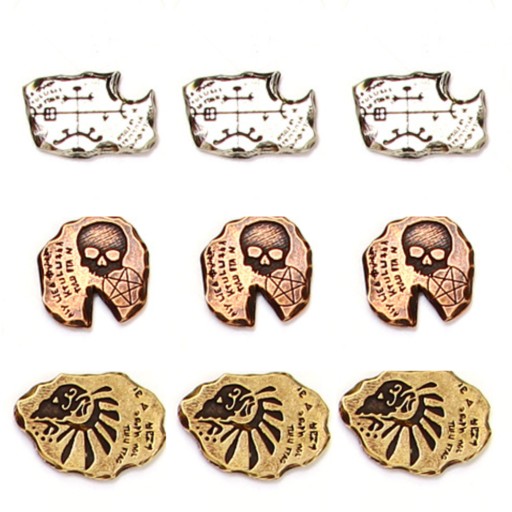Wykonany ze stopów cynku zestaw 9 cudownych, ciężkich monet, które przedstawiają motywy związane ze śmiercią i okultyzmem.