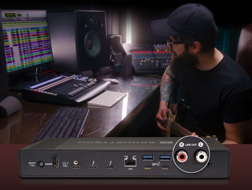Stacja dokująca Echo 20 Thunderbolt 4 SuperDock jest wyposażona w stereofoniczne złącza RCA. Wyjścia RCA zapewniają spójny dźwięk na poziomie liniowym, łącząc słodką bibliotekę muzyczną z parą zasilanych głośników. Wyjścia RCA są również idealne do bezpośredniego podłączenia do amplitunera, wzmacniacza mocy lub miksera.
