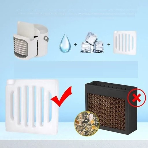 Nasz cichy mini klimator bez filtra oznacza: ponieważ zamiast filtrów używamy okładów z lodu. Tradycyjne ciche przenośne mini klimatory twierdzą, że filtry oczyszczają powietrze. W rzeczywistości po kilku miesiącach filtr staje się czarny i śluzowaty, pomimo użycia wody destylowanej.