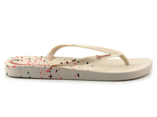 Klapki damskie brazylijskiej marki Ipanema zostały wykonane z wysokogatunkowego tworzywa, które jest bardzo elastyczne i miękkie, przyjemne dla stopy. Taki materiał jest wodoodporny - nie przyjmuje wody i szybko schnie, dlatego świetnie sprawdzi się na wszelkie wyjazdy oraz wypady na plażę czy basen. Podeszwa jest lekka i elastyczna, łatwo się zgina i dopasowuje. Fason japonek lepiej trzyma stopę niż klasyczne klapki. Beżowy kolor urozmaicono różowym zdobieniem w postaci plamek.