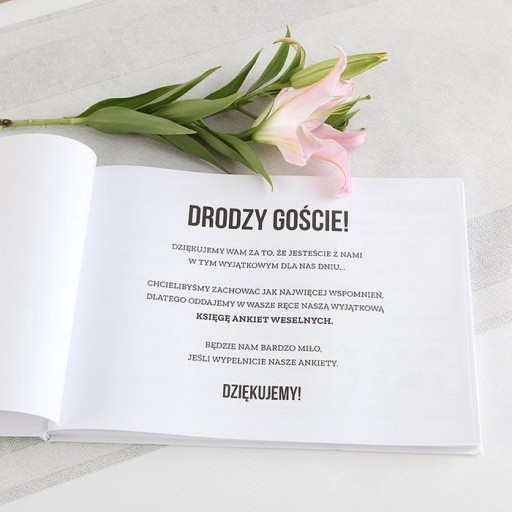 - Księga zawiera aż 100 stron (na jednej stronie jest ankieta, druga strona jest pusta na indywidualne, kreatywne wpisy gości oraz zdjęcia!)