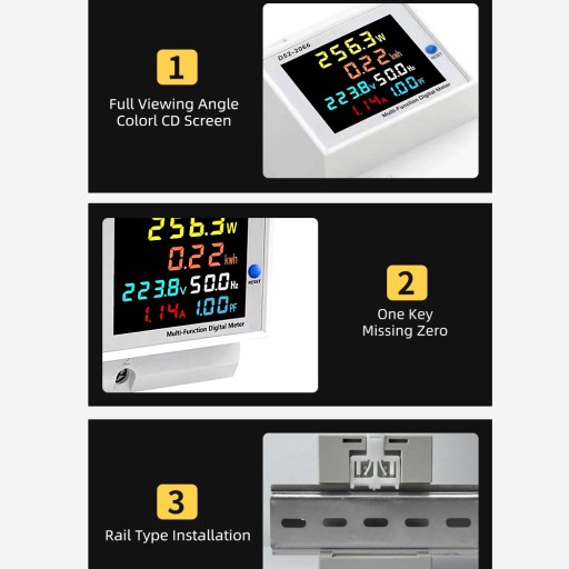 Wielofunkcyjny licznik energii elektrycznej typu szynowego D52-2066 jest przeznaczony do jednoczesnego wyświetlania 6 parametrów, takich jak napięcie AC, prąd AC, moc czynna, współczynnik mocy, częstotliwość i moc elektryczna na liczniku. Część wyświetlacza miernika przyjmuje kolorowy wyświetlacz LCD z pełnym widokiem, różne parametry są wyświetlane w różnych kolorach, co jest łatwe do zrozumienia na pierwszy rzut oka.