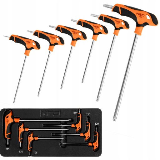 Zestaw kluczy typu TORX marki NEO (nr ref. 84-264) składa się z 6 sztuk kluczy, wykonanych z wysokiej jakości stali S2. Zestaw zawiera najbardziej potrzebne rozmiary kluczy wyposażonych w ergonomiczny, dwumateriałowy uchwyt typu T. Narzędzia dostarczane są w praktycznej wytłoczce z tworzywa, pasującej do szuflad szafek narzędziowych NEO 84-221 i 84-222. 25-letnia gwarancja producenta potwierdza wysoką jakość narzędzi. Marka NEO spełnia oczekiwania profesjonalistów.