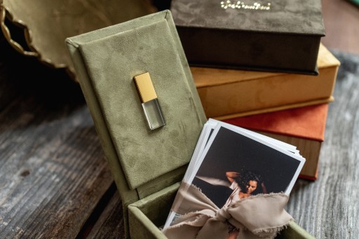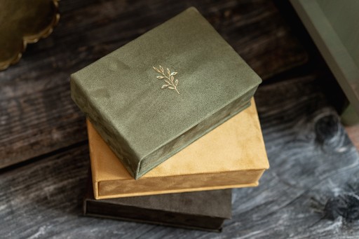 Aksamitne pudełko na zdjęcia 13x18 cm, w kolorze oliwkowym, ze złotym stemplem "listki" + pendrive szklany.