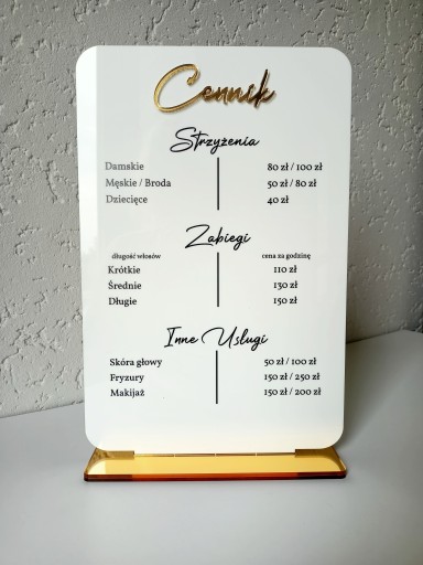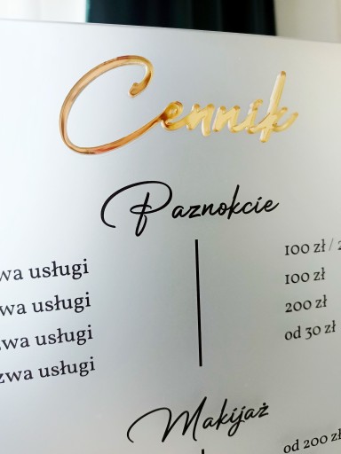 Cennik Akrylowy z drukiem uv i dodatkami ze złotego lub srebrnego lustra.
