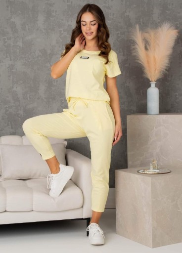 Spodnie o klasycznym fasonie na przodzie dwie zakładki , długość 3/4 , aplikacja z logo firmy na nogawce