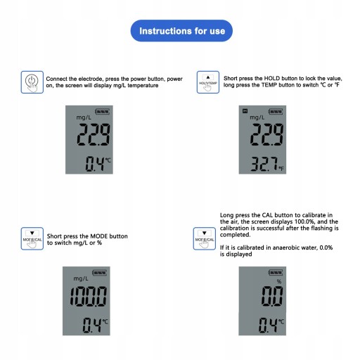 ⭐ Przetestuj wartość DO (rozpuszczonego tlenu) i temperaturę (℃/℉) wody. Ułatwienie użytkownikowi wykonywania operacji na miejscu w celu wyświetlania wartości i temperatur rozpuszczonego tlenu.