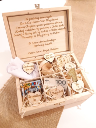 Drewniane pudełko z przegródkami to wyjątkowy prezent na chrzest, roczek, urodziny. Personalizacja pozwala wykonać oryginalny prezent na różne okazje. Prezent będzie pamiątką na wiele lat.