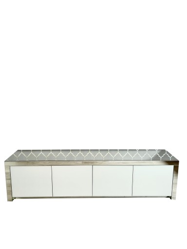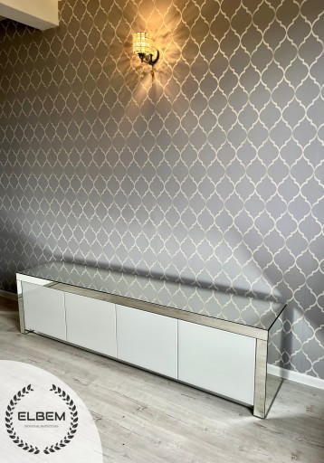 Przedstawiamy Ci stylową szafkę RTV w wyrafinowanym stylu Glamour, która stanie się ozdobą Twojej przestrzeni rozrywki. Ta lustrzana szafka RTV posiada cztery białe szklane fronty drzwiczek, które dodają elegancji i nowoczesności.