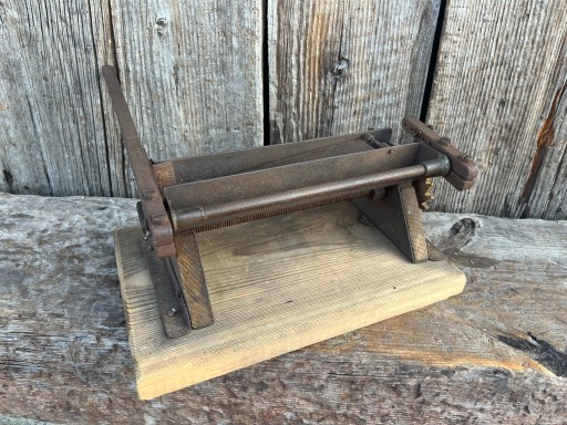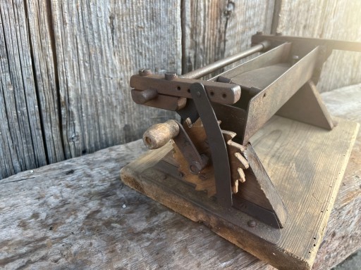 Bardzo stara ręcznie wykonana przez ludowego kowala.Maszynka sprawna.Wymiary podstawy drewnianej: długość 30cm,szerokość 20cm.Maszynka warta uwagi!!!