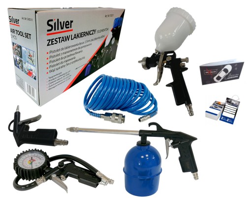 Profesjonalny zestaw pneumatycznych narzędzi lakierniczych do malowania, lakierowania, przedmuchiwania, ropowania i pompowania.